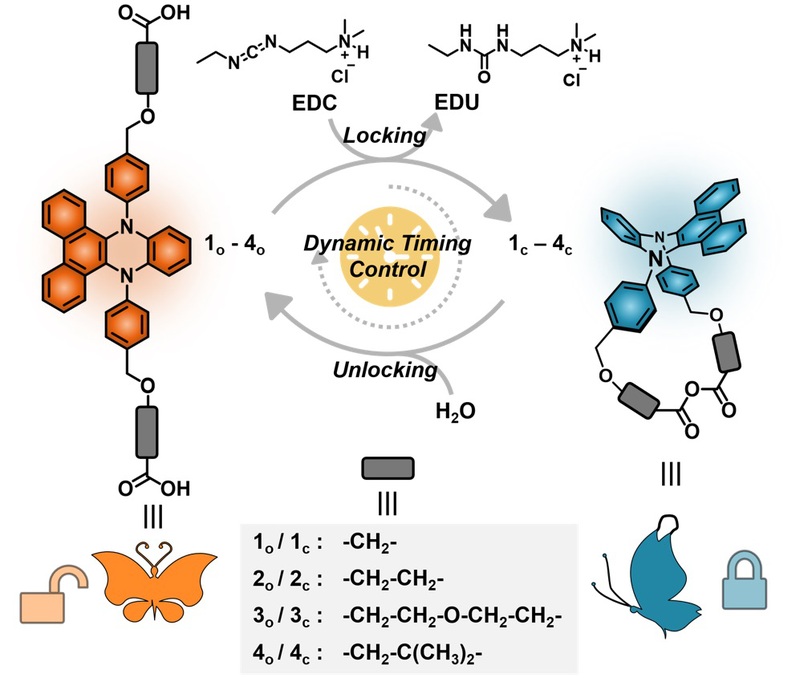 二氢二苯并吩嗪类衍生物(DPAC)是田禾院士团队开发的具有振动诱导发光特性的“明星”分子。在光激发下,DPAC分子会表现出具有独特的构象自适应多色发光行为。在前期工作中,多种策略已被成功地应用于构建以DPAC为荧光核的多色发光体系,比如共价环化、非共价环化、机械互锁相互作用、聚合物中的微环境控制等。为进一步实现时间尺度上的动力学控制,研究人员在DPAC的两端引入羧基封端的柔性链,将功能化的DPAC分子溶解在水性介质中,添加化学燃料EDC驱动分子内的环化反应,调控荧光团DPAC的构象自由度,改变荧光发射波长。这些分子锁通过和环境内水分子发生的水解反应,自动地解锁回到初始状态,实现了对体系时间尺度下的动力学控制。对侧链结构的精细化设计可以改变分子锁的荧光发射和寿命,实现对荧光颜色和动力学性质的多重调控。
